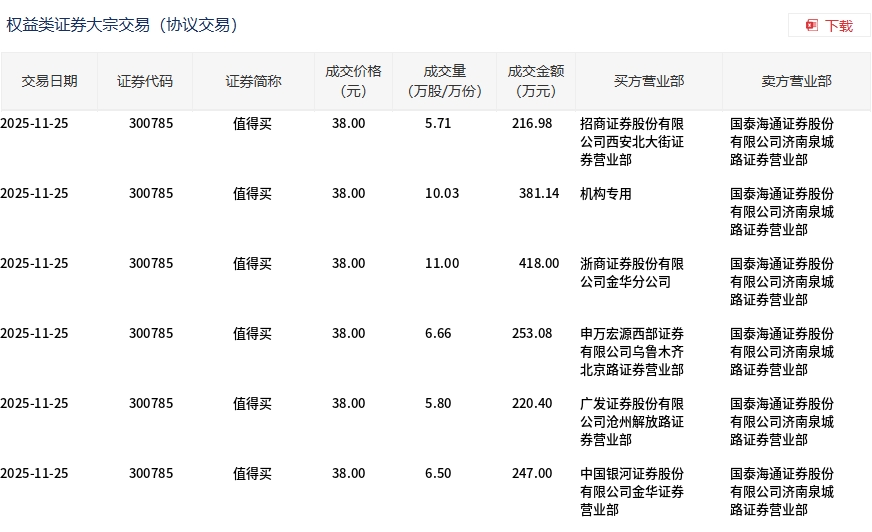 值得买今日大宗交易折价成交45.7万股,成交额1736.6万元