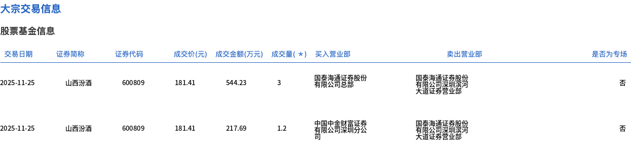 11月25日,山西汾酒大宗交易成交4.2万股,成交额761.92万元,占当日总成交额的1.08%,成交价181.41元,较市场收盘价192.99元折价6%。