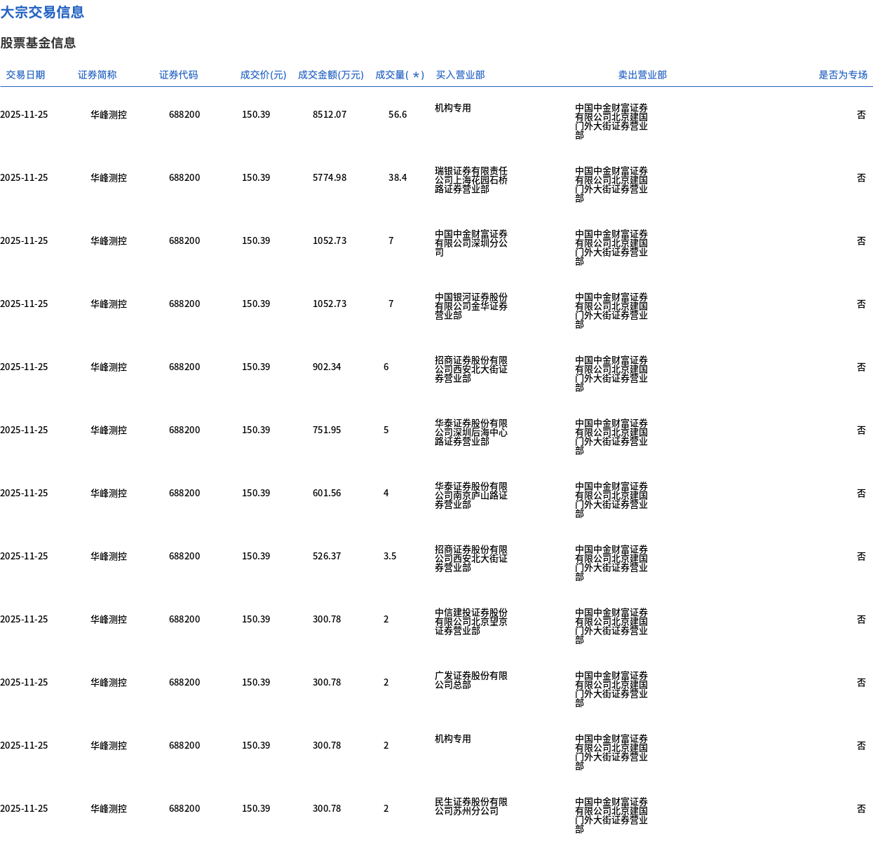 11月25日,华峰测控大宗交易成交135.5万股,成交额2.04亿元,占当日总成交额的33.5%,成交价150.39元,较市场收盘价165.16元折价8.94%。