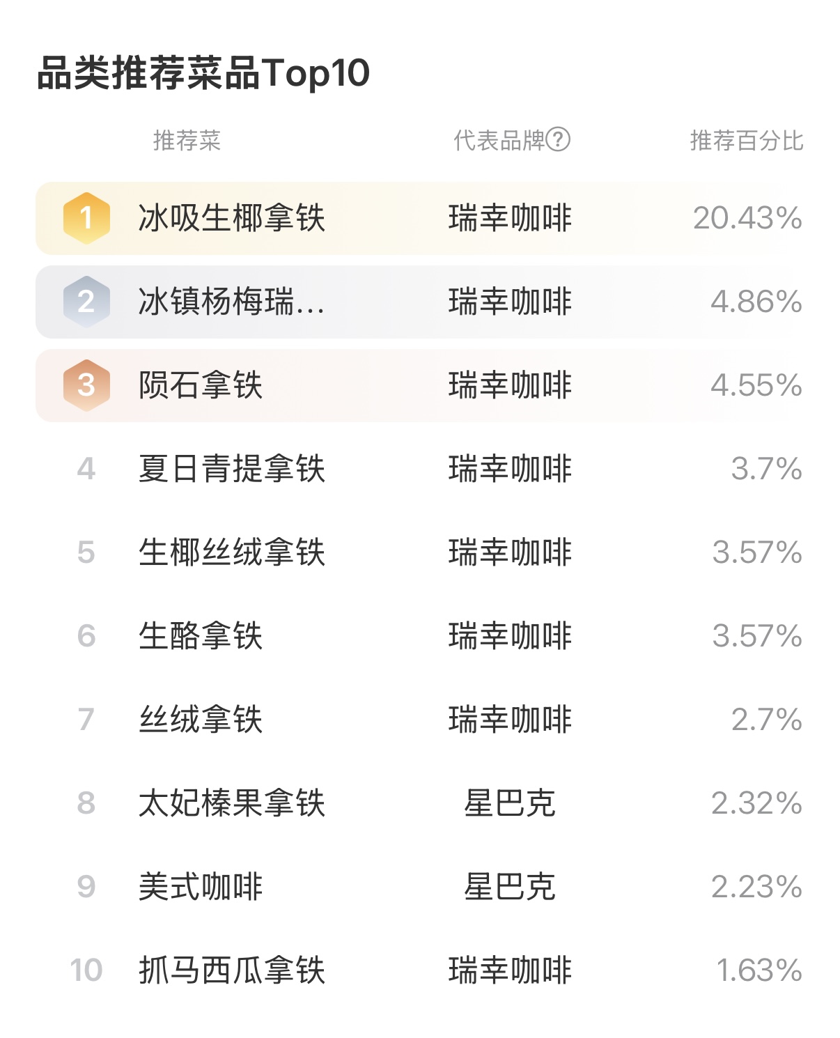 而要有销量,只靠“鲜奶”概念不够,还得打造爆品,但产品创新难度之高不言自明。事实上,窄门餐眼显示,咖啡品类推荐产品TOP10中,瑞幸多达8款,星巴克2款,其它品牌没能上榜。