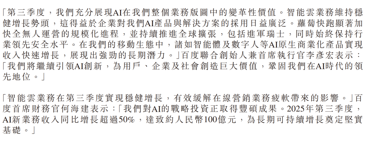 而在财报中,AI也是百度重点着墨的绝对“C”位:AI云强劲增长33%;萝卜快跑全球化提速,本季度订单同比猛增212%,飙升至310万单;在移动生态中,智能体和数字人等AI原生应用也得高增;文心5.0(文小言)展現强大性能……
