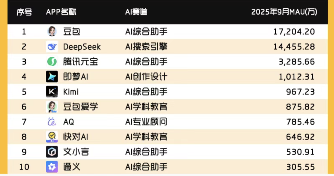 Questmobile统计,文小言今年9月的月活用户数堪堪超过500万,在对应的排行榜上位列第九,与字节旗下豆包(1.72亿月活)、DeepSeek(1.44亿月活)、腾讯旗下元宝(3285万月活)等,相距甚远。