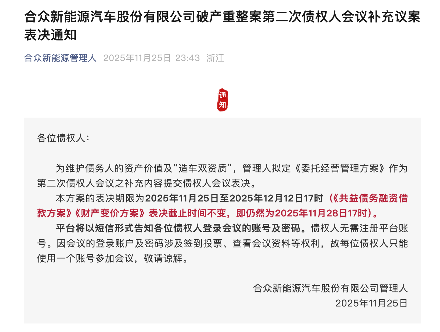 11月25日晚间,合众新能源汽车股份有限公司(哪吒汽车实体公司)管理人发布通知称,为维护债务人的资产价值及“造车双资质”,管理人拟定《委托经营管理方案》作为第二次债权人会议之补充内容提交债权人会议表决。本方案的表决期限为2025年11月25日至2025年12月12日17时(《共益债务融资借款方案》《财产变价方案》表决截止时间不变,即仍然为2025年11月28日17时)。