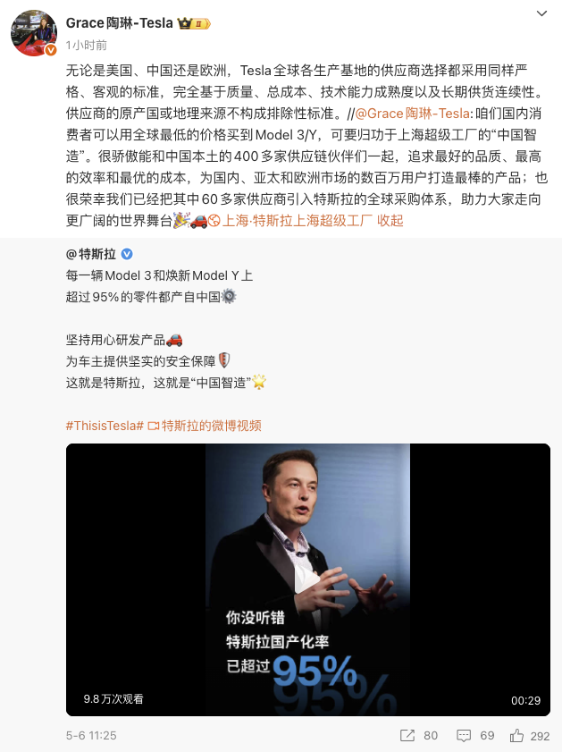 11月26日,特斯拉副总裁陶琳发文表示:无论是美国、中国还是欧洲,特斯拉全球各生产基地的供应商选择都采用同样严格、客观的标准,完全基于质量、总成本、技术能力成熟度以及长期供货的连续性,供应商的原产国或地理来源不构成排除性标准。