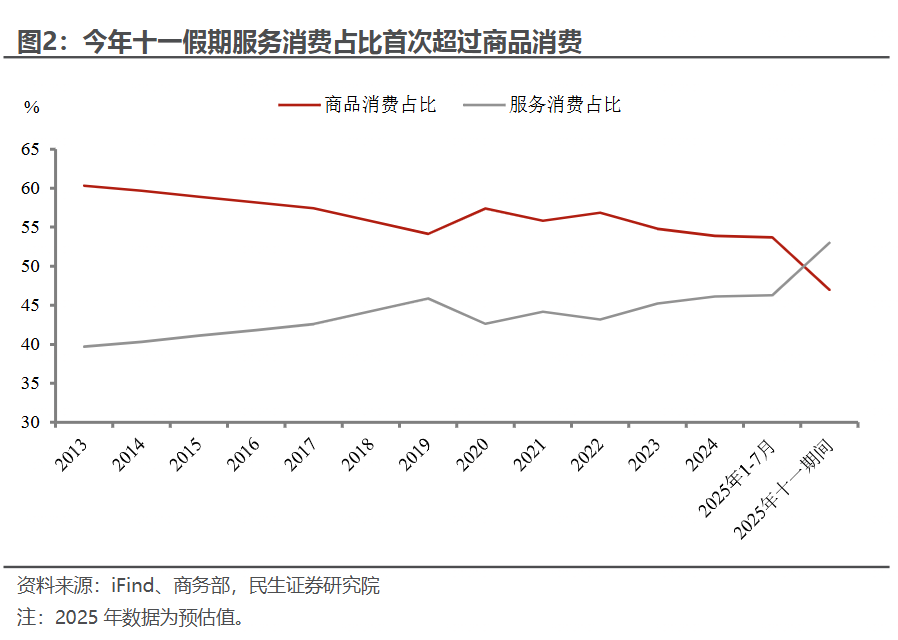 上图中灰线代表的“服务消费占比”,从2025年三季度出现明显上升趋势,并于2025年“十一”假期实现对“商品消费占比”的反超。民生证券发布的“十一”假期经济动态点评中提到,商务部监测数据显示,10月1日至3日,全国服务消费(餐饮、文旅、娱乐等)同比增长21%,占比首次超过商品消费,达到53%。