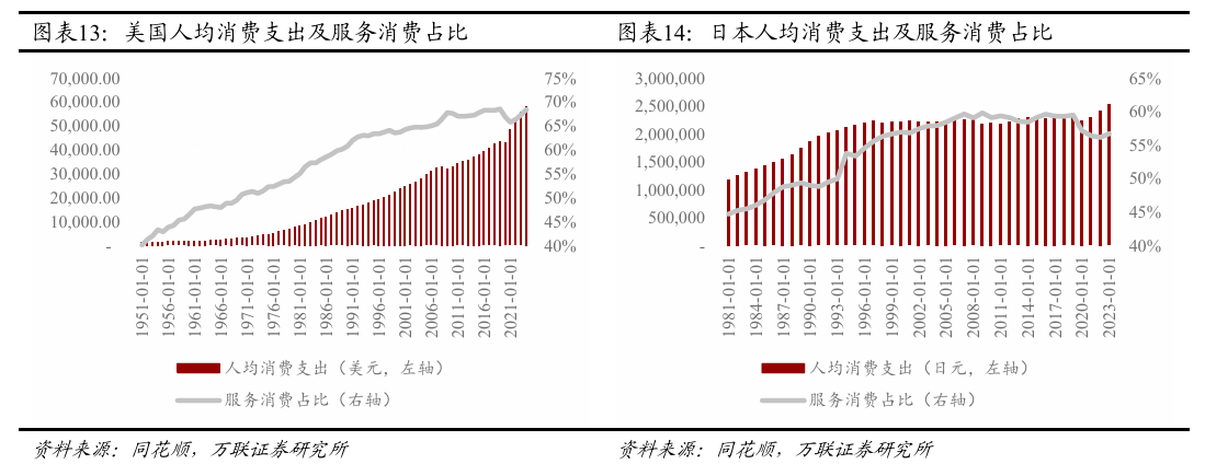 从国际经验上看,服务消费占比突破50%的门槛后,往往进入快速提升阶段。例如美国1979至1988年间占比自53%升至60%,年均提升0.7个百分点;日本1993至1999年间由50%升至57%,年均增幅达1.2个百分点。