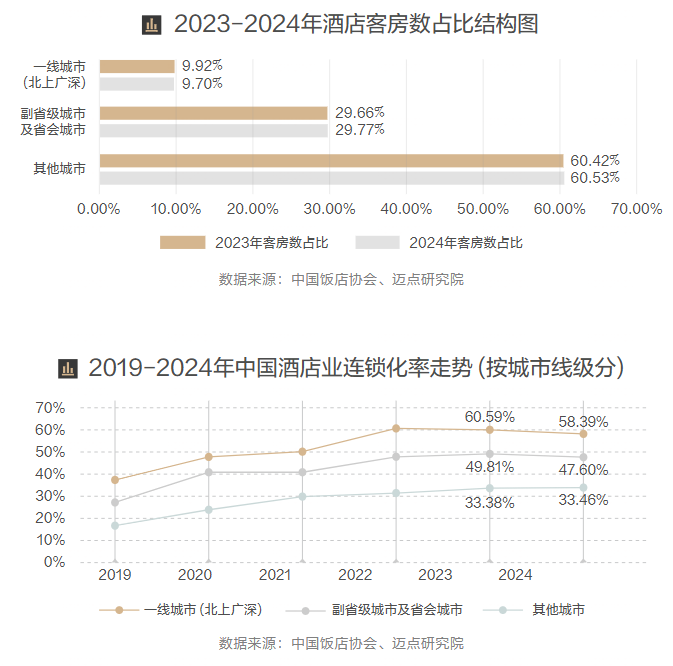 根据《2025中国酒店业心动趋势报告》,除一线城市、副省级城市以及省会城市之外的“其他城市”是酒店客房数最集中的区域。当一线城市、副省级城市和省会城市的连锁化率走势有所下降,这部分区域的酒店连锁化率仍保持稳健增长,并逐渐成为中高端酒店加速扩张的“主战场”。