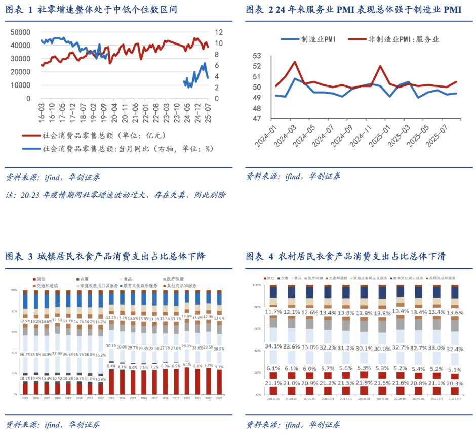服务消费的积极变化,并非是昙花一现,而是大势所趋。根据华创证券发布的社服行业2025年中期投资策略,在整体增速降档的消费大盘之下,食品、衣着为代表的产品消费占比总体下降,而服务相关的消费占比有所提升。从整体PMI (采购经理指数) 来看,服务业 PMI 在近两年里总体高于制造业 PMI,反映了不同行业的整体水温。