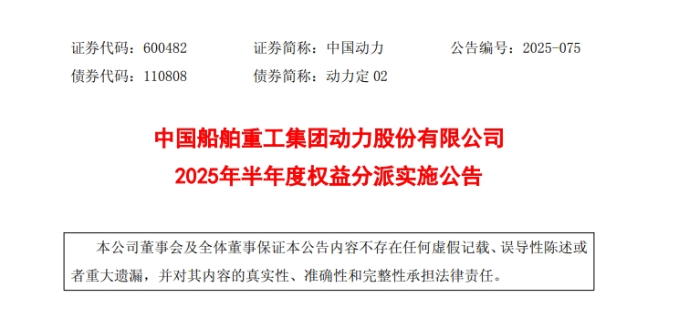 近日,中国船舶重工集团动力股份有限公司(证券代码:600482,以下简称“中国动力”)公布了2025年半年度权益分派实施公告。