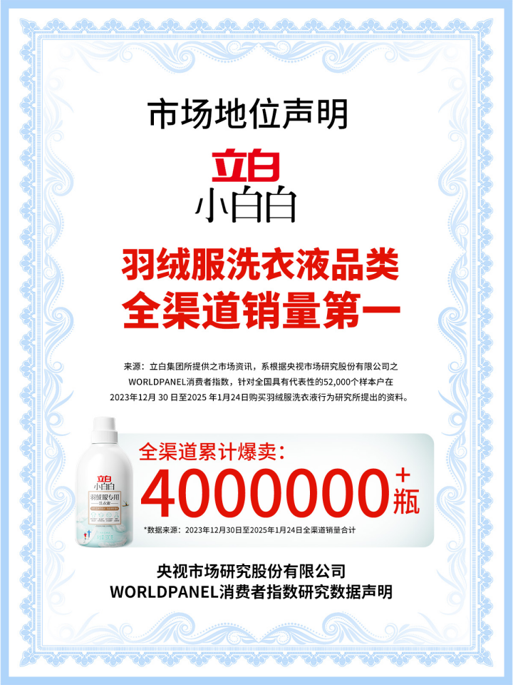 当代都市白领在事业、家庭与热爱之间奔波,常常无暇顾及衣物洗护的细节,只能无奈“潦草应对”。于是,面对大众消费者“干洗价高、手洗结块”的羽绒洗护困扰,立白小白白品牌于2023年年底精准切入羽绒专洗赛道,凭借专业的产品力迅速打开市场。截至今年1月,品牌已实现全渠道销量第一②,累计售出超400万瓶,成功登顶羽绒服洗衣液品类榜首。