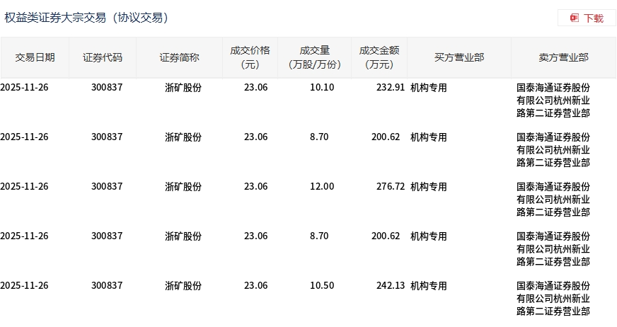 11月26日,浙矿股份大宗交易成交50万股,成交额1153万元,占当日总成交额的14.19%,成交价23.06元,较市场收盘价25.48元折价9.5%。