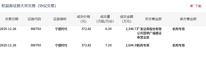 11月26日,宁德时代大宗交易成交13.5万股,成交额5033.07万元,占当日总成交额的0.71%,成交价372.82元,较市场收盘价372.82元持平。