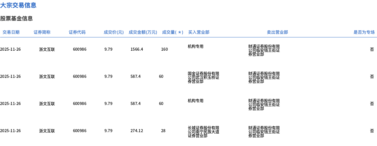 11月26日,浙文互联大宗交易成交308万股,成交额3015.32万元,占当日总成交额的2.65%,成交价9.79元,较市场收盘价9.99元折价2%。
