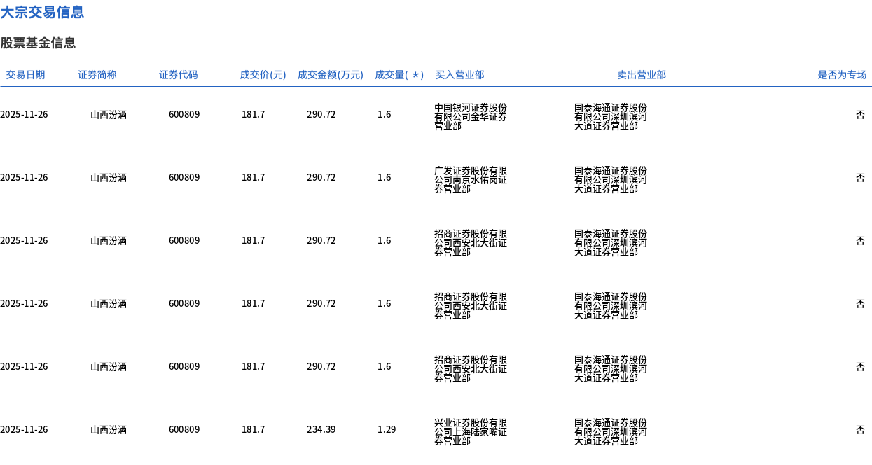 11月26日,山西汾酒大宗交易成交9.29万股,成交额1687.99万元,占当日总成交额的3.34%,成交价181.7元,较市场收盘价193.3元折价6%。