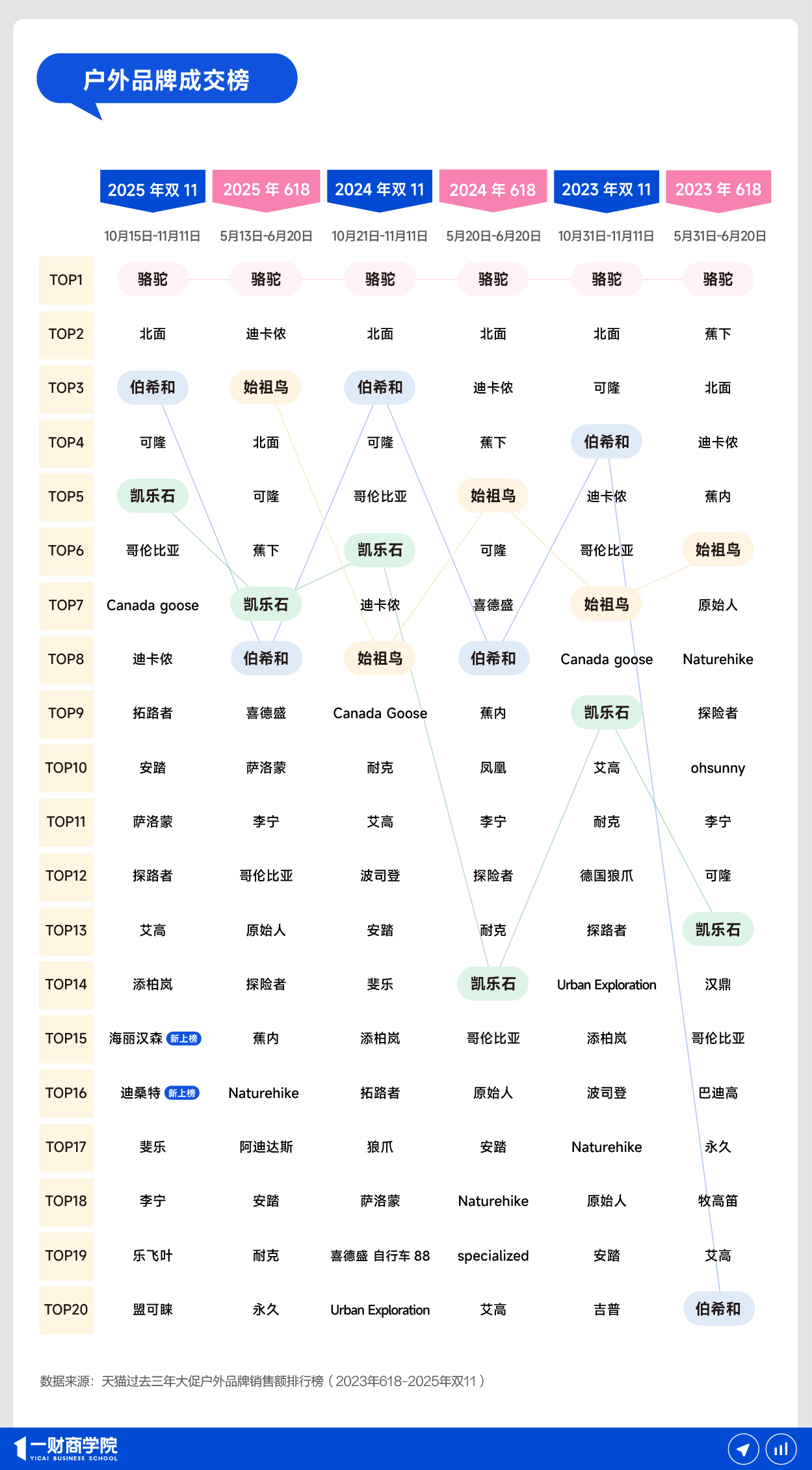 今年天猫发布的双11专业户外品牌成交榜上,始祖鸟跌落至20名开外。从天猫历年户外品牌的成交榜数据来看,2024年双11,始祖鸟还位列成交榜第8名,甚至在2025年的618榜单上,一度冲到第3名。