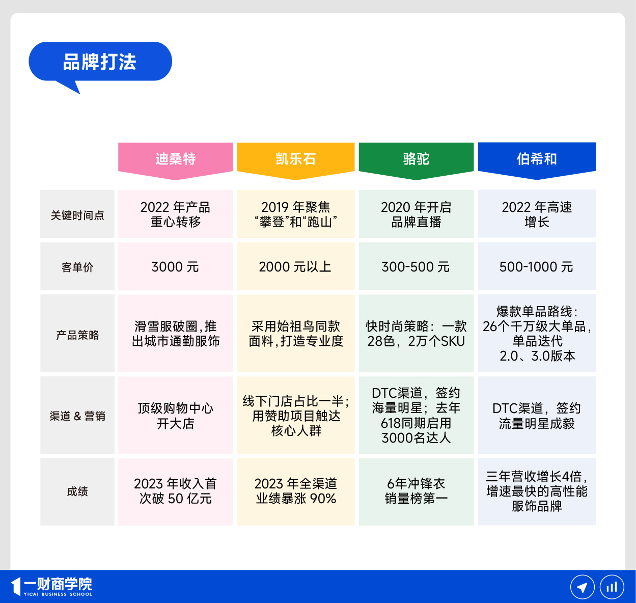 在一个高增长的行业上,品牌呈现不同的活性,不论是“宽赛道、高周转”的电商打法,还是“窄赛道、深耕耘”之路。从打法上,骆驼、伯希来侧重“大”市场,用平替声量+明星效应,在DTC渠道布局海量SKU或大单品网罗“轻户外”群体;凯乐石专注在专业赛道,用极致产品+品牌故事打造国产口碑,顶替国际大牌声望。迪桑特则从滑雪服破圈至城市通勤,用高端大店塑造高端形象,贴近核心人群。