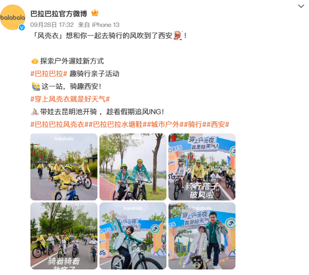 今年9月,巴拉巴拉发起“好天气亲子骑行”活动,在西安、武汉、南宁等多座城市策划穿越风洞等互动游戏;配合产品方面,品牌新推出风壳衣单品竞逐儿童户外装备领域,官方数据显示,该产品上市后全网曝光量超3000万,让超过10万组家庭在骑行中体验产品性能。