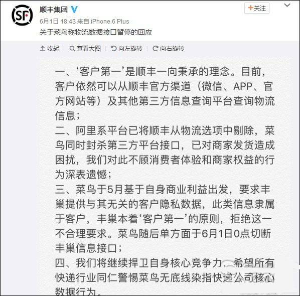 5月31日晚上6点,顺丰:我们要暂停菜鸟的物流数据接口哦。