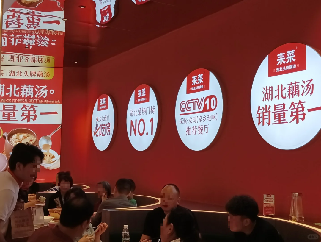 其次是店内的装修,多处展示诸如“每年卖出的藕汤可摆满30座黄鹤楼”“湖北藕汤销量第一”等标语,通过数据化、口号化的表达,强化其在藕汤品类中的头部位置。为突出毛三节这一食材优势,来菜直接将莲藕模型嵌在墙上,并配文强调“只用中间2-3节煨汤”“3.7倍膳食纤维”等卖点。