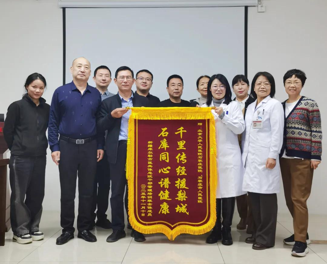 在培训圆满完成之际,参训学员代表专程送来书写“千里传经援梨城 石库同心谱健康”的锦旗,以此感谢石家庄市人民医院为他们提供高质量培训和专业指导。