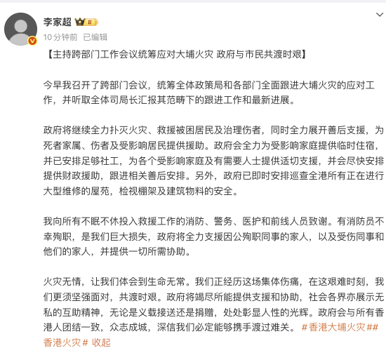 香港特别行政区行政长官李家超11月27日发文表示,今早已召开跨部门会议,统筹全体政策局和各部门全面跟进大埔火灾的应对工作,并听取全体司局长汇报其范畴下的跟进工作和最新进展。