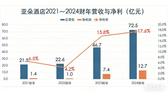 过去数年,亚朵的财务表现呈现出典型的拐点式变化。2021—2022 年,营收维持在 20 亿元区间、净利率约 5%。到了 2023 年,收入跃升至 46.7 亿元,2024 年进一步达到 72.5 亿元;2025 年前三季度仍保持29.8%、37.4%、38.4% 的同比增速。这一变化让“2023 年发生了什么”成为行业讨论的核心。