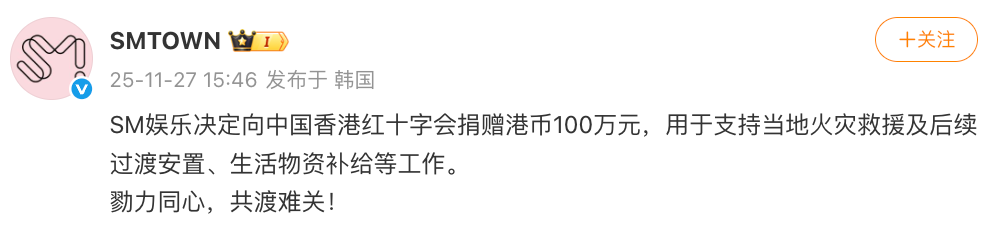 11月27日,SM娱乐表示,决定向中国香港红十字会捐赠港币100万元,用于支持当地火灾救援及后续过渡安置、生活物资补给等工作。