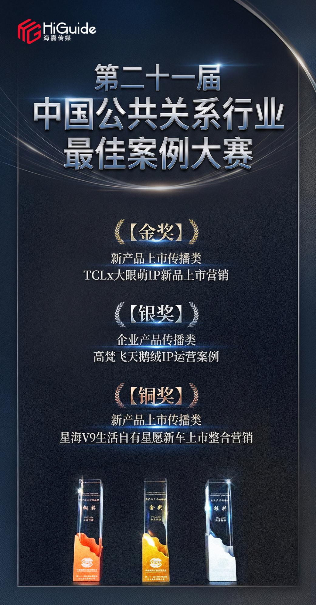 作为公关行业极具影响力的年度盛会,本届大赛金奖案例56个、银奖案例58个、铜奖37个。海嘉传媒荣获金奖、银奖、铜奖各1个:【TCL×大眼萌IP新品上市营销】荣获新产品上市传播类金奖,【高梵飞天鹅绒IP运营】荣获企业产品传播类银奖,【星海V9生活自有星愿新车上市整合营销】荣获新产品上市传播类铜奖。