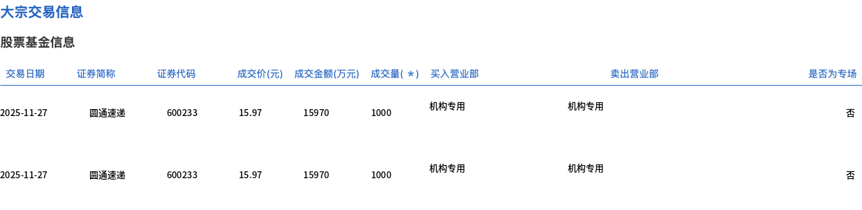 11月27日,圆通速递大宗交易成交2000万股,成交额3.19亿元,占当日总成交额的70.2%,成交价15.97元,较市场收盘价16.99元折价6%。
