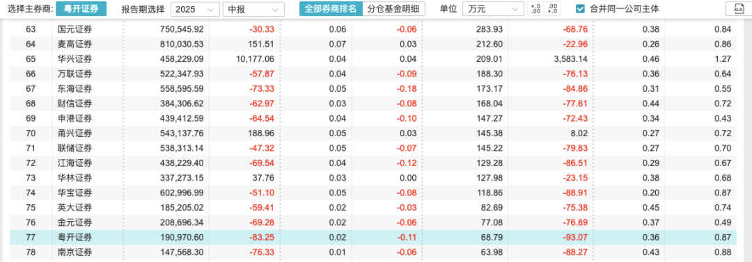 Wind数据显示,2022年至2024年,该公司分仓佣金分别为5933.84万元、3844.65万元、1082.93万元;同比分别下滑15.21%、35.21%、71.83%。而到2025年上半年,粤开证券的分仓佣金收入仅为68.79万元,同比下滑93.07%,在94家券商中排名77位。
