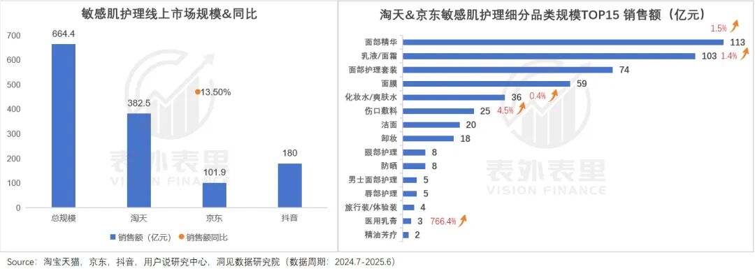 “药不能停”式的庞大需求,让一个千亿市场拔地而起。如下图,截至2025年6月,中国线上敏感肌护理市场规模整体达到664.4亿元。
