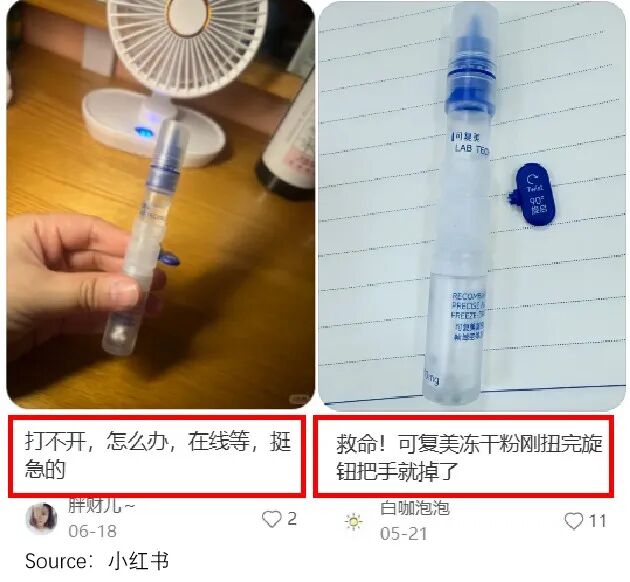 “问题就出在,开启方式设计得跟渡劫似的。”Lemon解释道,开关稍一用力,就容易扭断,且需要很大力才能推动包材,让液体和冻干球融合。报废的这支就是完全推不动,自然无法融合。