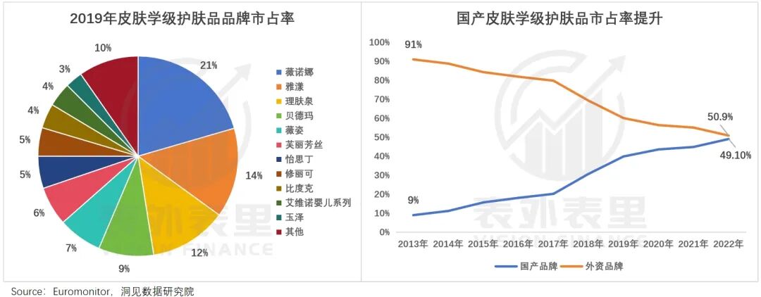 这样一来,消费者会如何选择不言而喻。如下图,2019年国产品牌薇诺娜、玉泽的市占率,荣登第一、第二;2022年国产皮肤学级品牌的市占率增长至49.1%,几乎和外资品牌持平。