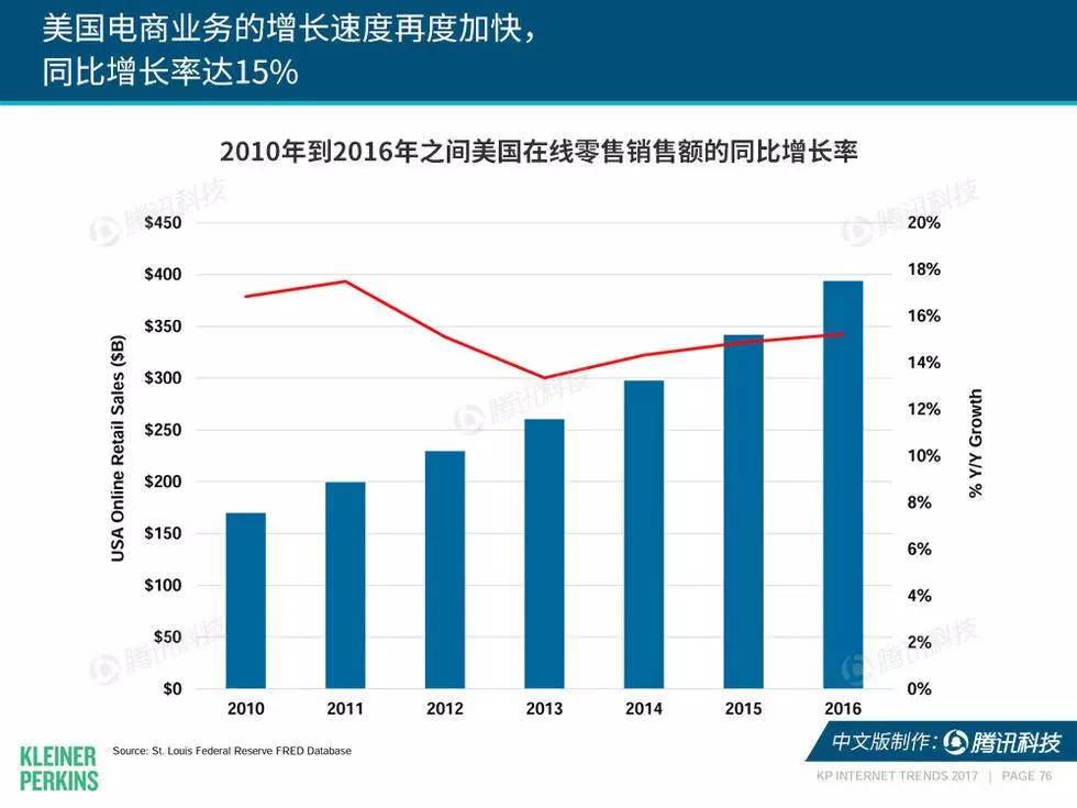 据美联储的FRED数据库统计,从2013年开始,美国在线零售销售额增速一直在加快增长,2016年的增速达到了近16%。亚马逊2016年销售额增长27%。新进军电商业务的沃尔玛的网上业务也表现亮眼:今年第一季度,公司电子商务销售大涨63%,为5年来最快涨幅。中国的电商更不必说了,阿里、京东的在线零售增速都在50%以上。