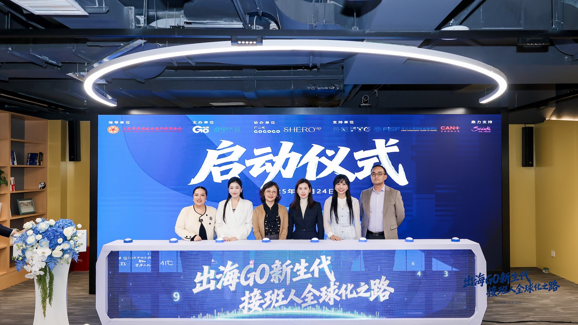 (从左至右)SheroUp商学院创始人李元卉、出海GO创始人及CEO刘伽、上海市黄浦区侨联副主席林雯玉、黄浦科创集团副总经理陈萌、厂二代GOGOGO创始人黄希谊、沙特旅游局大中华区营销主管丁剑敏