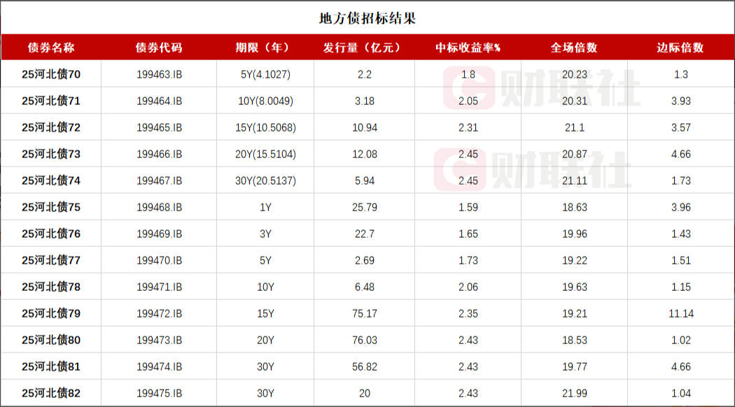 据财联社消息,河北省政府十三期地方债已招标结束,投标倍数均在18倍之上。