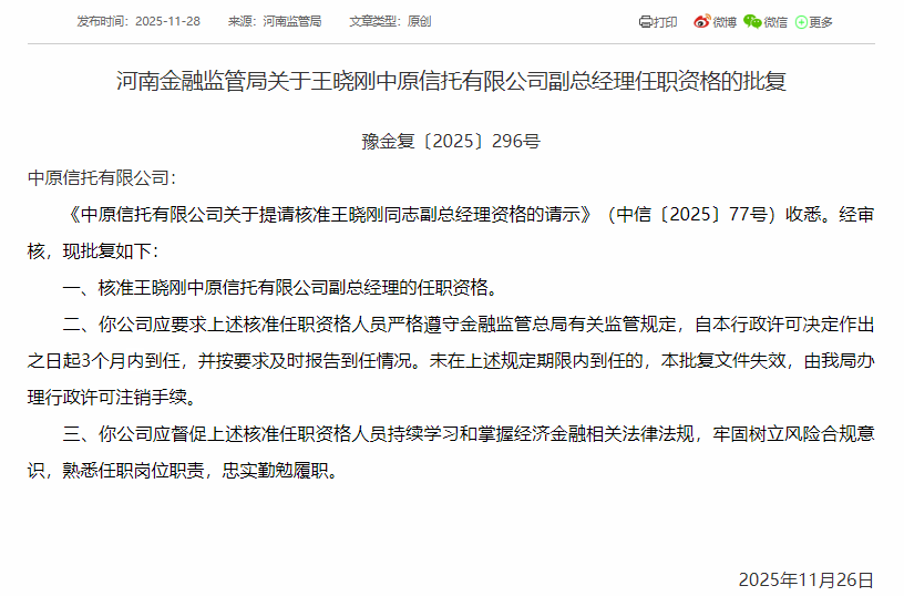 11月28日消息,国家金融监督管理总局官网显示,河南金融监管局作出王晓刚任职资格的批复。经审核,核准王晓刚中原信托有限公司副总经理的任职资格。批复指出,中原信托应要求上述核准任职资格人员严格遵守金融监管总局有关监管规定,自本行政许可决定作出之日起3个月内到任,并按要求及时报告到任情况。