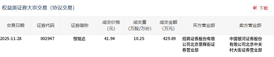 11月28日,恒铭达大宗交易成交10.25万股,成交额429.89万元,占当日总成交额的2.96%,成交价41.94元,较市场收盘价44.61元折价5.99%。