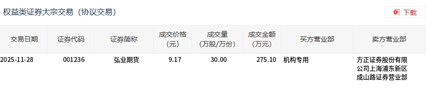 11月28日,弘业期货大宗交易成交30万股,成交额275.1万元,占当日总成交额的3.47%,成交价9.17元,较市场收盘价10.28元折价10.8%。