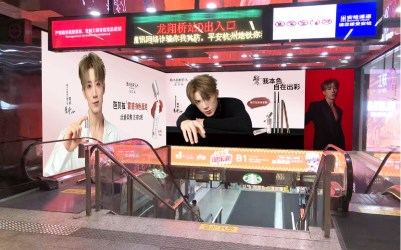 杭州湖滨银泰商圈作为核心打卡区,龙翔桥地铁口地铁口大屏与仁和路主题通道形成视觉联动,纯白基底晕染#L502细语陶然的温柔质感,呼应鹭卓日常温润气质;炽热红调凸显#L516柿叶半火的舞台张力,一柔一刚不仅诠释唇泥两大核心色号的独特特质,更映现出鹭卓的双面魅力。红白视觉反差巧妙融入唇泥产品卖点——丝滑雾感、持久锁色、3g大容量等优势通过场景化叙事深入人心。