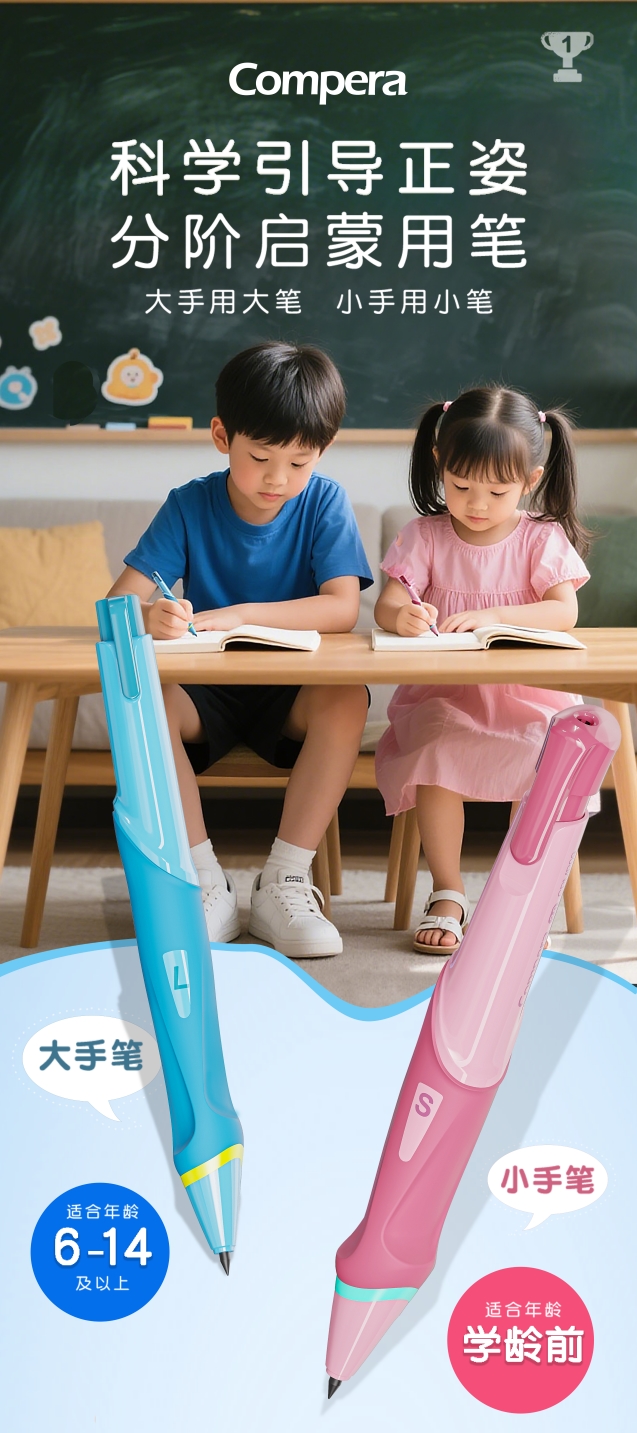 Compera 大小手正姿笔从中国儿童的手部发育特点出发,进行了全方位的细节打磨。在笔杆适配性上,产品突破传统单一尺寸设计,通过大量市场调研与儿童手部数据采集,划分出两种尺寸规格:手长≥135mm 的孩子选用大笔(L 码),手长<135mm 则适配小笔(S 码),贴合不同年龄段儿童的手掌大小与握持需求,让孩子握笔时更舒适、更稳固,减少因握笔不适导致的姿势偏差。