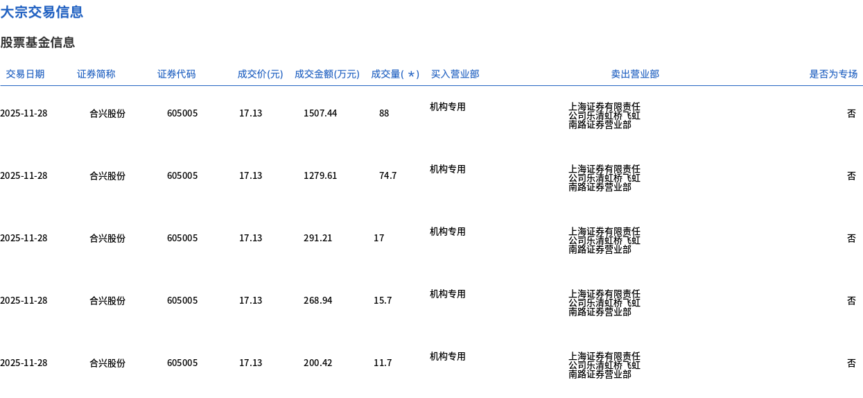 11月28日,合兴股份大宗交易成交277.3万股,成交额4750.14万元,占当日总成交额的58.33%,成交价17.13元,较市场收盘价19.1元折价10.31%。