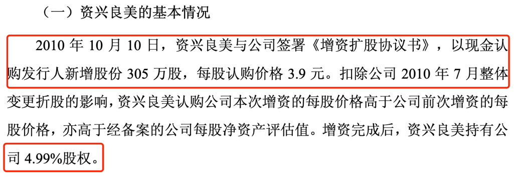 鲟龙科技在创业板递交的招股书显示,2010年10月,资兴良美以每股3.9元的价格认购鲟龙科技新增股份305万股。增资完成后,资兴良美持有鲟龙科技4.99%股份。
