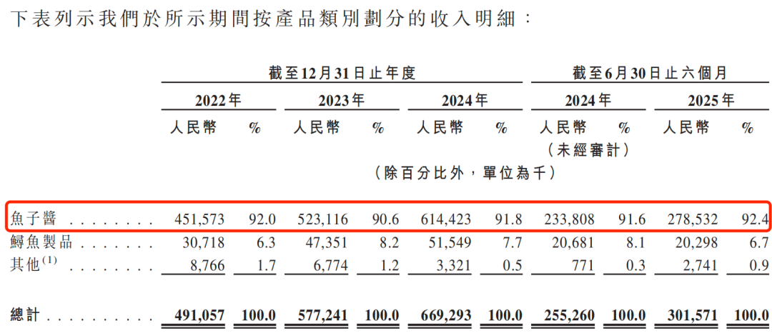 而鱼子酱正是公司的核心盈利支柱,也是驱动业绩增长的绝对主力,超九成收入来自鱼子酱。招股书显示,报告期内,鱼子酱收入占总收入的比例分别为92%、90.6%、91.8%和92.4%,产品结构较为单一。