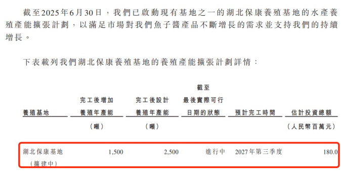 截至2025年6月30日,鲟龙科技计划在已有的湖北保康养殖基地增加1500吨产能,预计投资1.8亿元,将于2027年第三季度完工,完工后预计产能将达到2500吨。