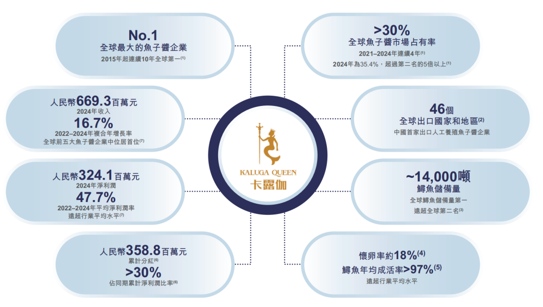 根据灼识咨询的资料,鲟龙科技自2015年以来连续10年实现鱼子酱销量全球第一。2024年,鲟龙科技鱼子酱销量占全球市场的比例高达35.4%。