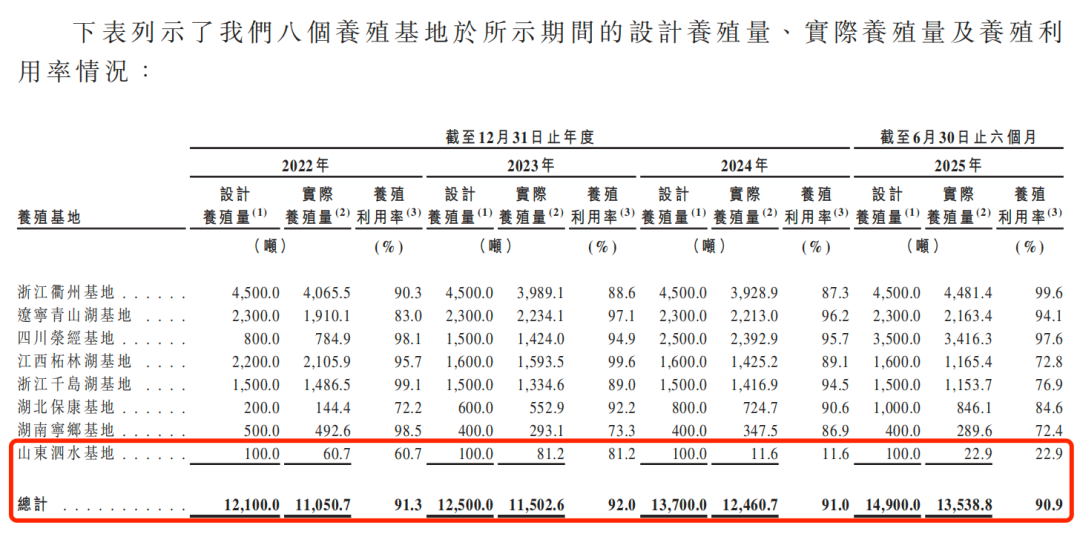 报告期内,这八个养殖基地的平均养殖利用率分别为91.3%、92%、91.0%和90.9%。其中,山东泗水基地的设计养殖量为100吨,报告期内养殖利用率分别为60.7%、81.2%、11.6%和22.9%,2024年出现“断崖式”下滑。