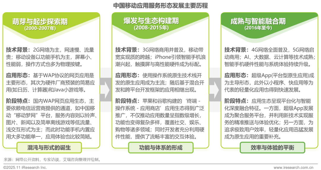 移动应用服务形态发展始于2G时代的萌芽期,彼时以功能简单的WAP网页应用为主;继而进入爆发期,随着3G网络与智能手机的普及,功能复杂、体验丰富的原生应用成为主流;步入成熟期后,在 4G/5G网络与AI等技术的加持下,呈现出“超级App”作为综合体验平台与“小程序”等轻量化应用作为便捷服务入口并存的新格局。移动应用服务形态演进的核心逻辑,始终围绕“如何更高效、更便捷地满足用户需求”展开。未来我们或将看到移动应用形态进一步 “解耦”(即功能拆分、场景化适配),更多元化的应用形态会在不同需求场景下,以最适配、最高效的方式为用户提供服务。