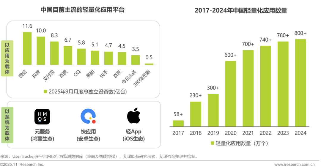 发展现状:微信、抖音、支付宝等超级应用,以及鸿蒙元服务、安卓快应用、苹果轻App,共同形成轻量化应用生态。当前轻量化应用超800万款,成为用户访问移动应用服务的重要入口。