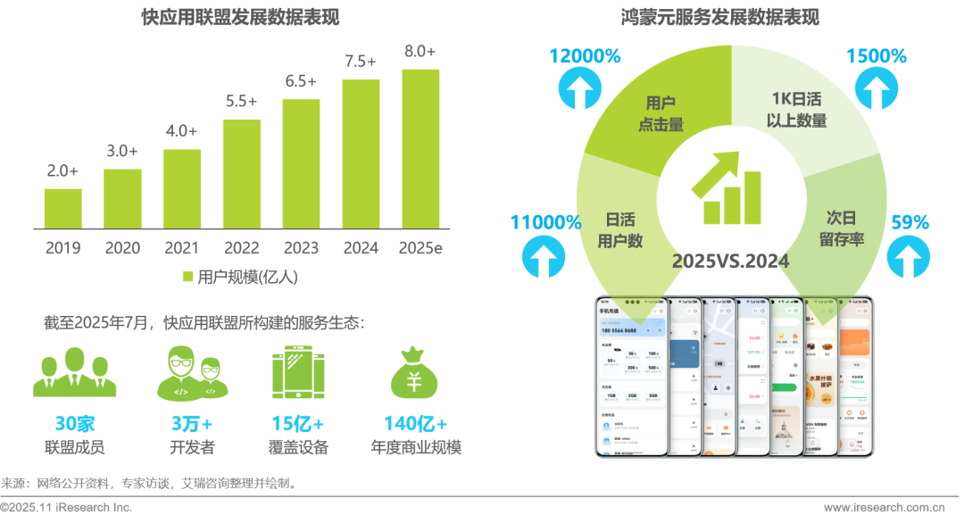 超级应用与操作系统“双轨驱动”的生态效应已在用户端得到充分验证。以快应用为例,其用户规模持续增长,预计2025年将突破8亿,较2019年诞生初期实现超过3倍增长;截至2025年7月,快应用联盟已汇聚30家厂商与超过3万名开发者,覆盖设备超过15亿台,年度商业规模突破140亿元,成功构建了全面繁荣的服务生态。与此同时,鸿蒙元服务也呈现爆发式增长,2025年的日活跃用户数、用户点击量等关键指标相较于2024年同期均有大幅提升,展现出强劲用户粘性与增长活力。这些数据均说明轻量化应用已从技术探索走向大规模普及,用户习惯已经深度养成,其便捷、低成本的优势正持续转化为不可逆的用户选择与坚实的商业价值。